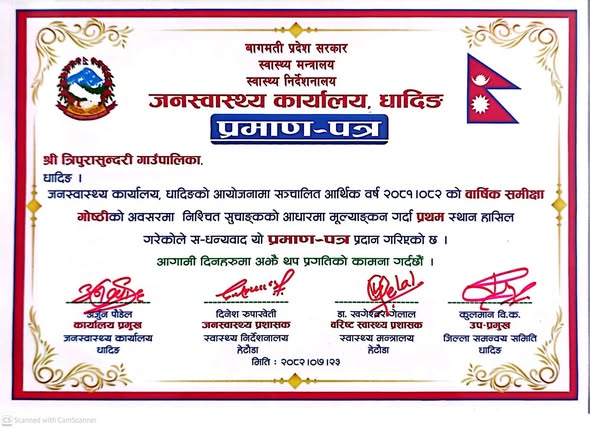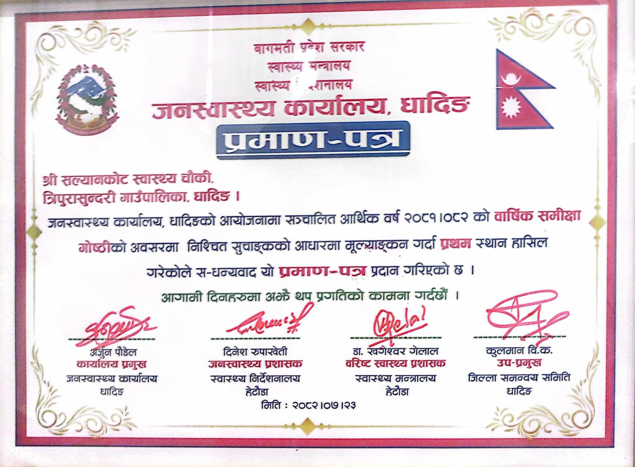 धादिङ : त्रिपुरासुन्दरी गाउँपालिका र सल्यानकोट स्वास्थ्य चौकी जिल्ला प्रथम घोषित